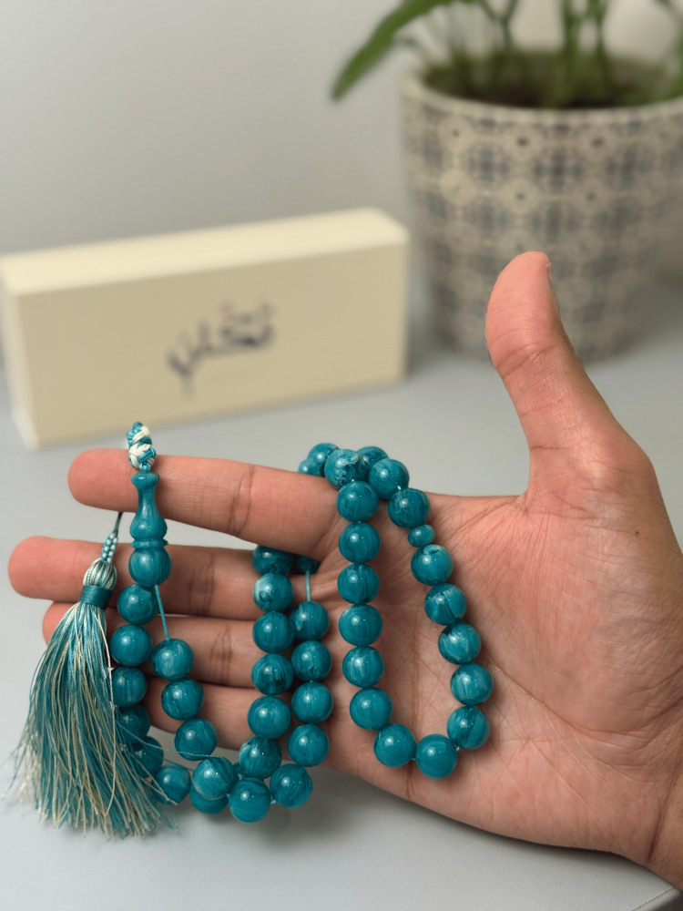 سبحة فاتوران سماوي عليها كركوشة تفصيل يدوي تضيف لمسة فخامة وأناقة للسبحة