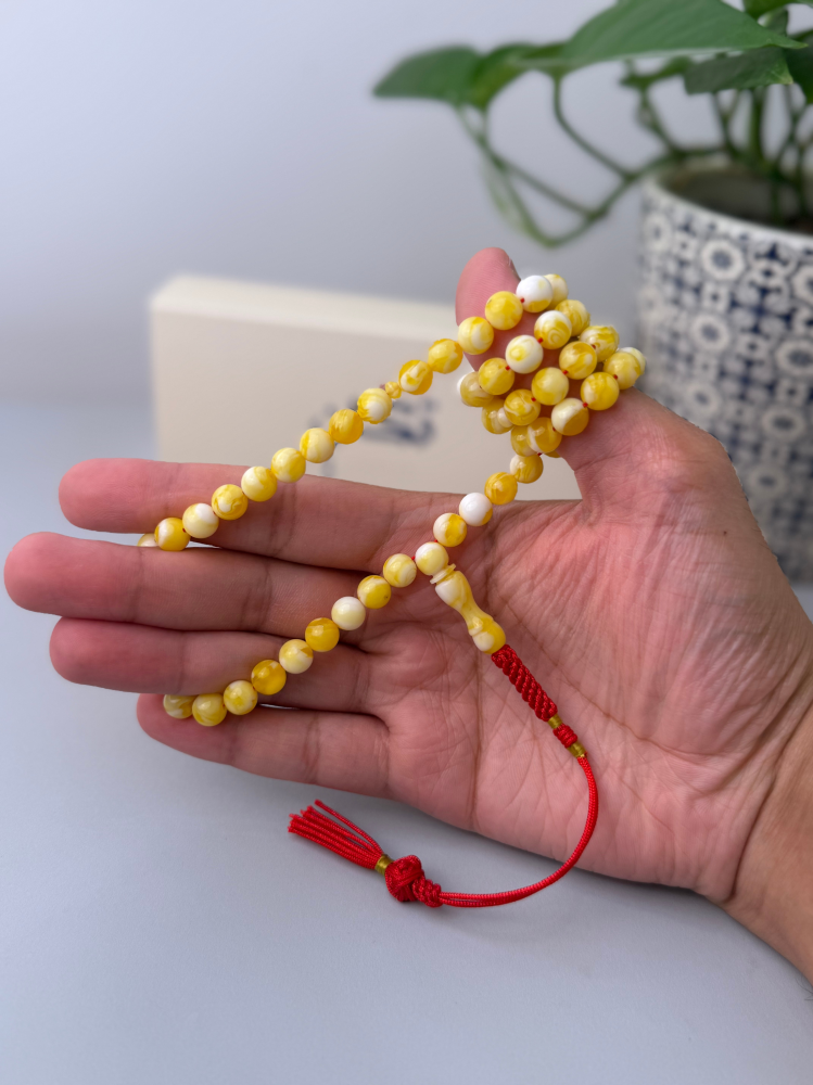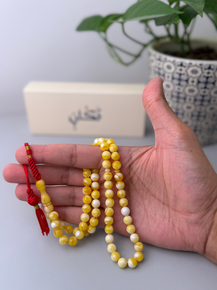 سبح تراب الكهرمان شبيهه بالكهرمان الطبيعي يتم صناعته عن طريق شوائب الكهرمان الطبيعي يتميز بتعريقة مميزة وتصميم فاخر